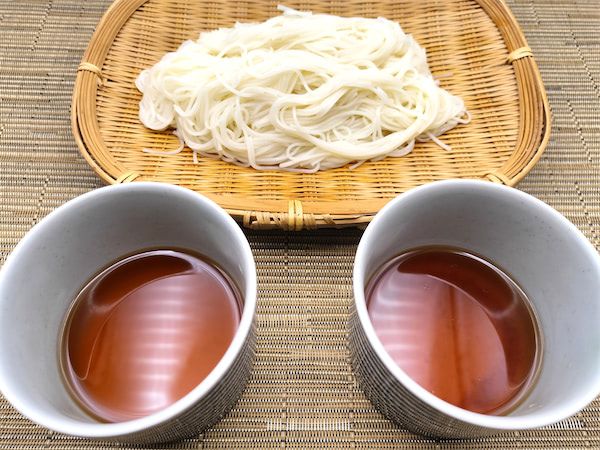 よく白だしをめんつゆの代わりに使う人がいますが、白だしには砂糖が入っていないので甘味が少なめで、逆にめんつゆは塩分が少なめです。これはもう好みの問題ですので、自分がおいしいと思う方で食べればいいのですが、どちらがよりお店で食べるそうめんのつゆに近いかというと、やはりめんつゆの方です。