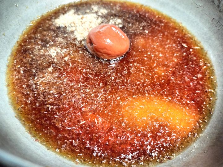 1. 鍋にしょうゆ、みりん、酒、塩、砂糖、かつお節、ハイミー、梅干しを入れて強火にかけます。