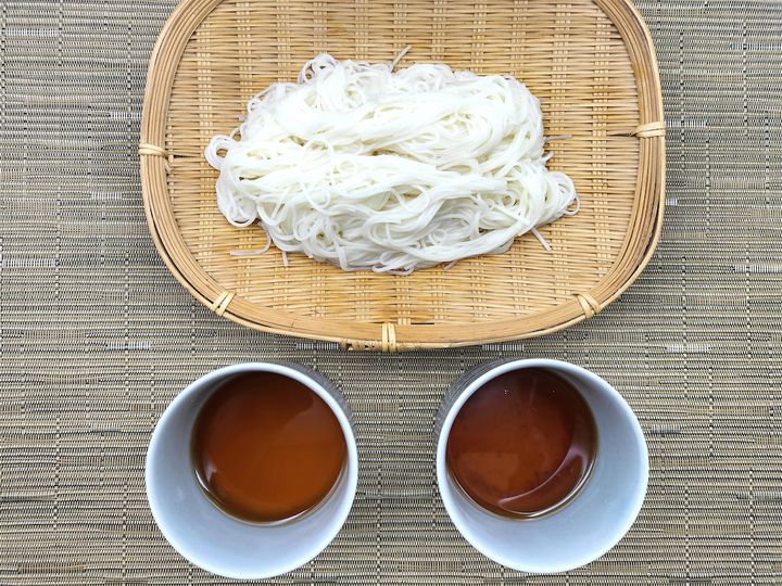 リュウジさんは、そうめん選手権と称して12種類のそうめんの食べ比べを動画で公開していますが、その中からおいしいと高評価の「揖保乃糸 手延素麺上級品」、「Vマーク 島原手延べそうめん」、「三輪素麺 鳥居 誉」の3種類を表示通りに茹でて、リュウジさんが動画で比較していた通りに2種類のそうめんつゆで実際に食べ比べてみました。