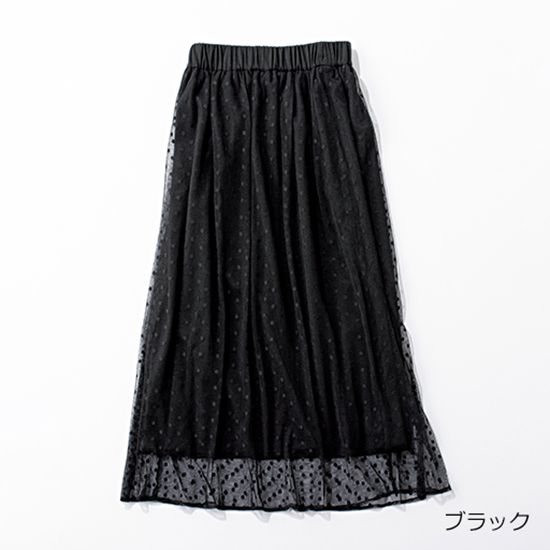 表側はドットのチュールスカート、裏を返せば無地なスカートの裾からドットのチュールがのぞく2WAY。シンプルにTシャツにコーディネートをしてもオシャレ指数高めに仕上がるのでとても便利!しかもウエスト部分はゴムだから着ていても楽ちんです。