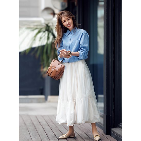 構築的なシルエットのバルーンスカートと人気の高いチュールスカートがドッキングして使える2WAYスカート。短か丈トップスで甘辛ミックスするのがオススメのコーデです。
