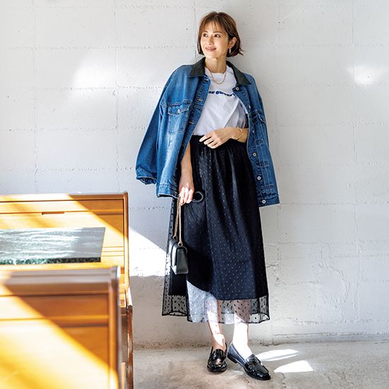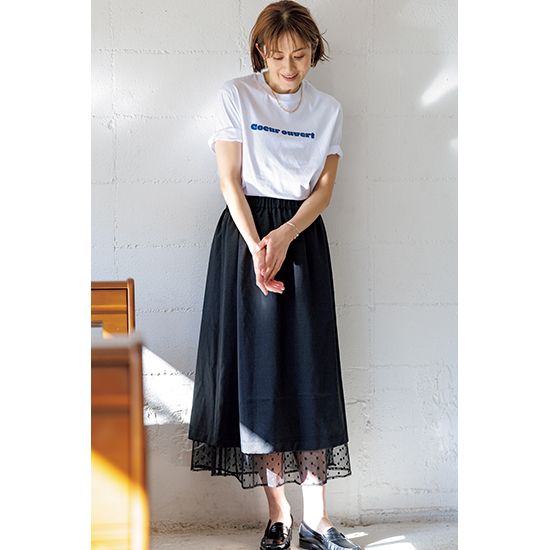 スカート¥13,970(I.T.’S. international)Tシャツ¥12,100(IKITSUKE/IKITSUKE笹塚店)バッグ¥27,500(ヴィオラドーロ/モンテグラート)フラットシューズ¥11,000(アルテミス by ダイアナ/アルテミス by ダイアナ アーバンドックららぽーと豊洲店)ラリエット¥13,200〈イットアトリエ〉コインネックレス¥8,800ロケットペンダント¥13,200〈ともにエイチアッシュ〉(すべてフォーティーン ショールーム)