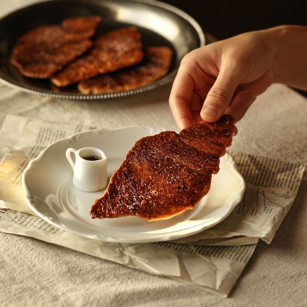 クロワッサンと韓国語で「おこげ」を意味する「ヌルンジ」を組み合わせた、甘さは控えめの韓国発のユニークなスイーツ。作り方は、クロワッサン生地をせんべいのように薄く伸ばし、両面に砂糖をまぶしてフライパンでじっくり焼くだけと簡単。生地を均一に広げて10分ほど両面を焼いたあと、冷蔵庫で冷やせば完成。