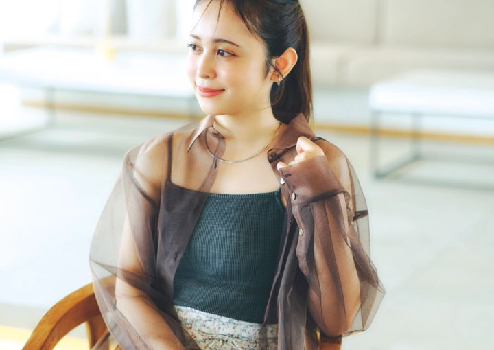大胆に透けるシースルーシャツは、同系色のキャミを合わせればなじみよく、上品にまとまります。華奢なストラップ&厚手の生地感で、下着見えしないキャミを選ぶのもポイント。