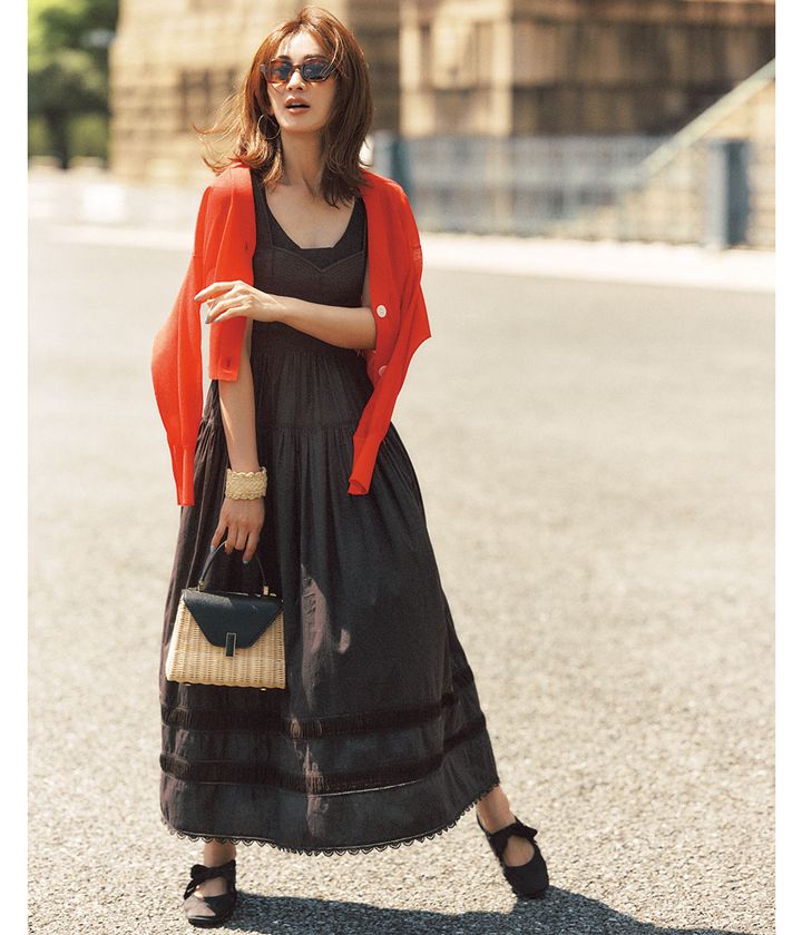 ノースリのマキシ丈は使える黒ワンピの代表フォルム。シンプルだからこそオールマイティで、裏を返せば手抜き感満載になるというトラップも……。パフ袖のGジャンやチュールのバッグなど、今っぽさをトッピングして更新感をとことん表現していくのが成功の秘訣です。
