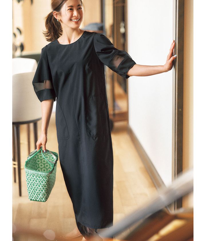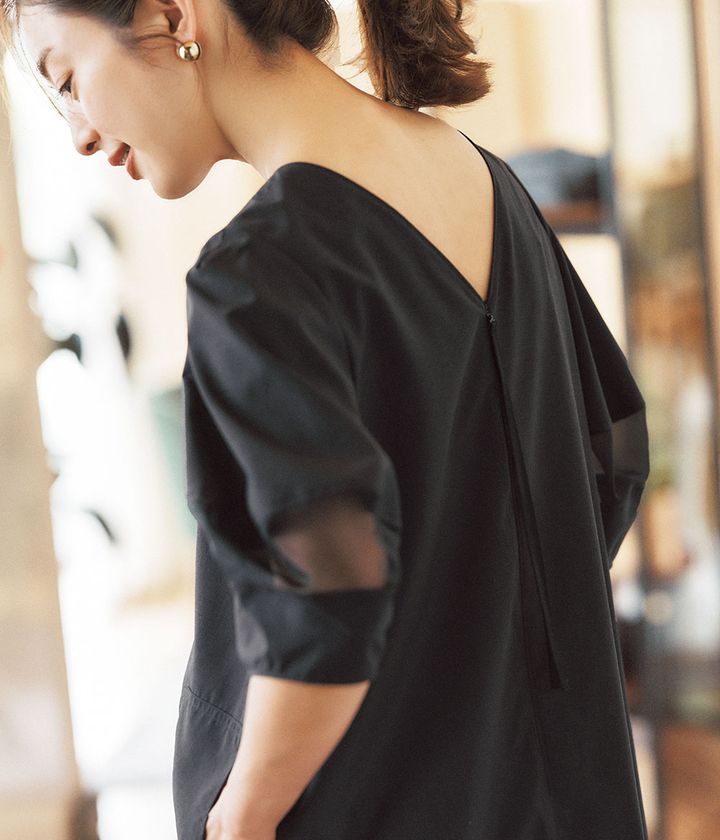 ずん胴ボディに見せないためには、切り替え上手な一枚を選ぶのがコツです。計算されたカッティングなら、すとんと落ちるシンプルなシルエットでも痩せ見え効果大。40代が自信をもてない二の腕からひじまでをまるごとふんわり包み込みながら、重たく見えないスリーブデザインも秀逸です。