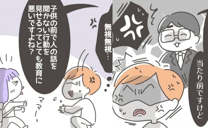 妻マウントで話を聞かせようとするすーちゃんパパですが、聞こえないフリを続けるチロちゃんママ。「子どもの前で人の話を聞かない行動を見せるって、教育にも悪いですよね?」