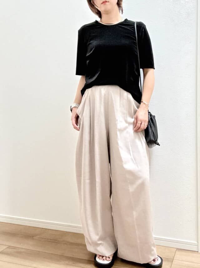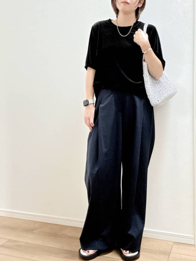 黒のシアーベロアTにネイビーのワイドパンツを合わせるだけで、簡単に洗練された印象に。Tシャツがベロア素材なだけで、シンプルなワンツーコーデでもグッと格上げされます。さらに、シルバーのバッグや白のサンダルを合わせて軽やかさを加えれば、夏らしい抜け感もしっかりキープできますよ。