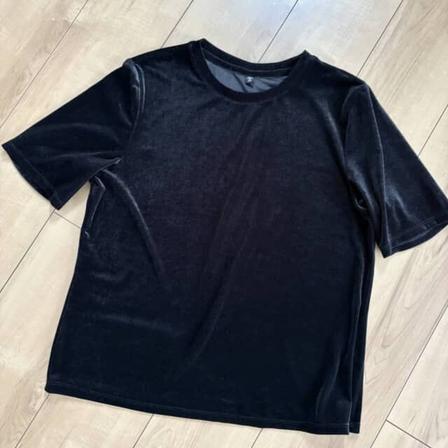 それがこちらの「シアーベロアT」(税込¥1,290)。秋らしいベロア素材ながら、透け感のある薄手のつくりで、夏でも快適に着こなせる優秀アイテムなんです。