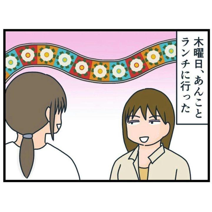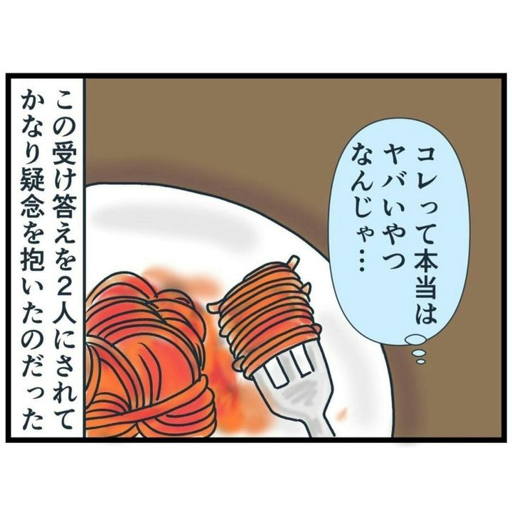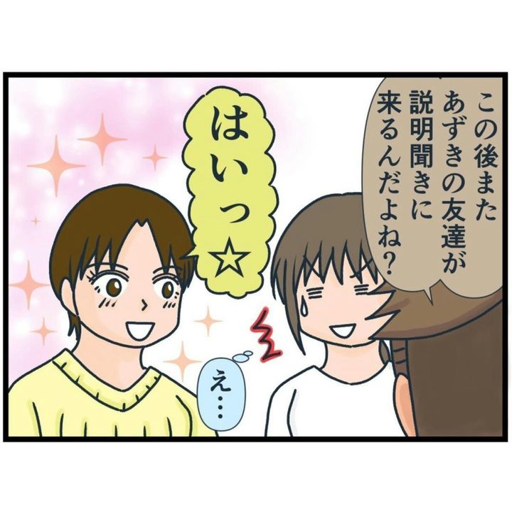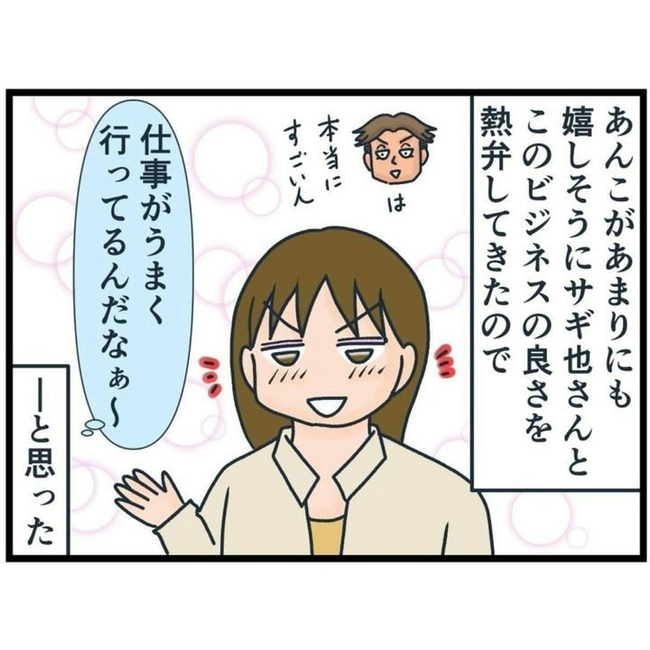 約束の日には、あずきとその友人・あんこ、そしてあずきとあんこが尊敬する・サギ也という人が同席しました。サギ也はあずきとあんこの上司に当たる人で、一緒に入ったファミレスで「調子のいいバイト」の説明がされます。所々、怪しいと思う点があったものの、「あずきの紹介する話だから大丈夫」と思ったナエくまさんは、そのバイトに登録します。