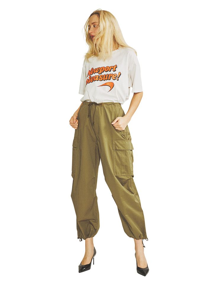 白Tシャツ/What’z up 原宿 カーキパラシュートパンツ/ユニオン ランチ(LITTLE LEAGUE IN C.) 黒パンプス/STACCA TO(バロックジャパンリミテッド)