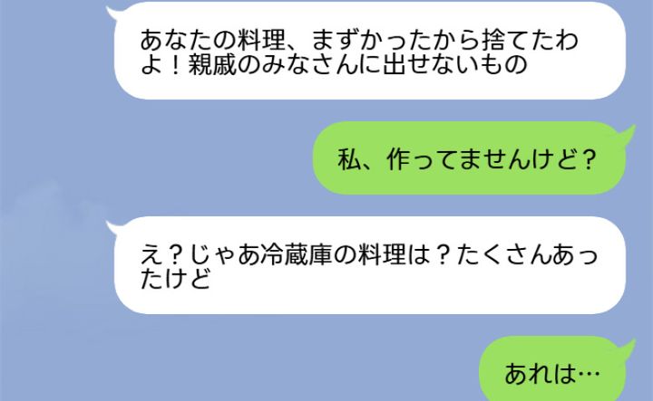 「あなたの料理、まずかったから捨てたわよ!親戚のみなさんに出せないもの」