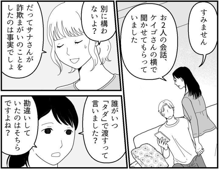 「勘違いしていたのはそちらですよね?」義姉が言うので、母はズバリ辛辣な言葉を返します。「詐欺師もそう言うのよ。だまされた方が悪い、みたいにね!」私も負けじと義姉に言い返します。「そうそう、だました自分を棚にあげてね!」