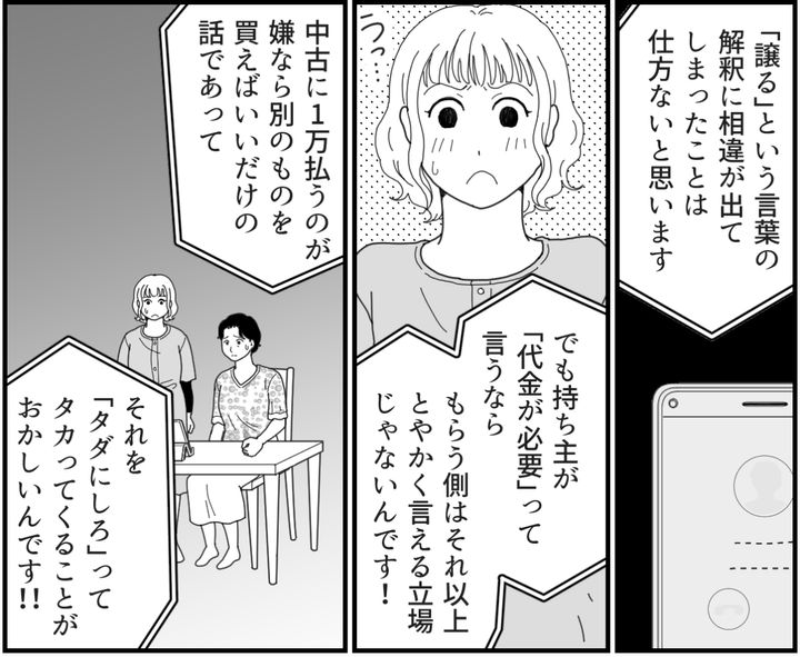 「図々しいのはそちらですよね?」義姉はいっそう強い口調になりました。「自分のものをもともと1万でお譲りしようと思っていたのに、勝手にタダで譲ってもらえると勘違いされたあげく、ここまで文句を言われる筋合いはないです」