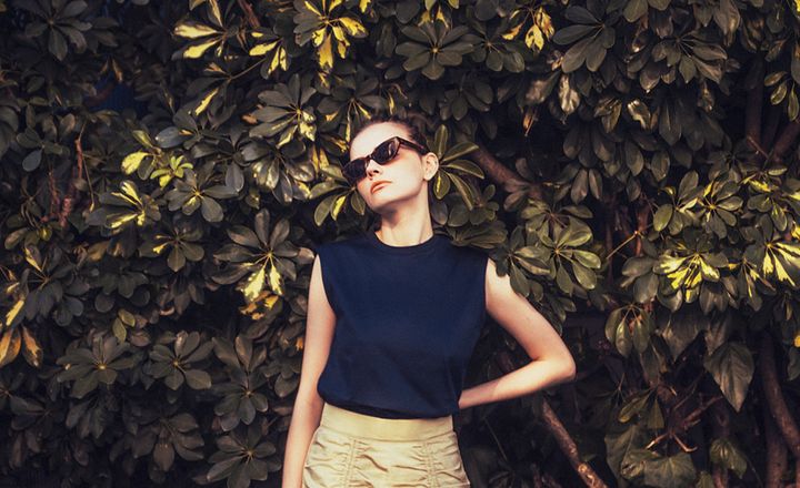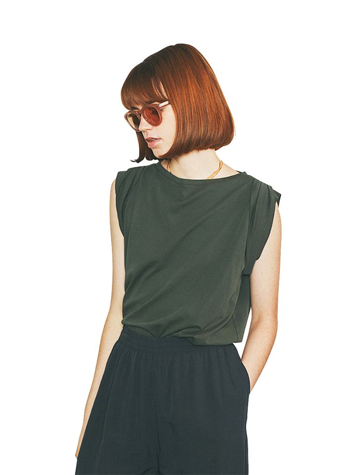 カーキトップス 17,600円/TICCA パンツは着まわし。サングラス 28,600円/ロンハーマン ネックレス 19,800円/ココシュニック オンキッチュ(ココシュニック) くしゅっと寄せたスリーブと横幅広めのネックで、ドライなカーキをレディに転換。黒ほど重たくないマイルドな色み。