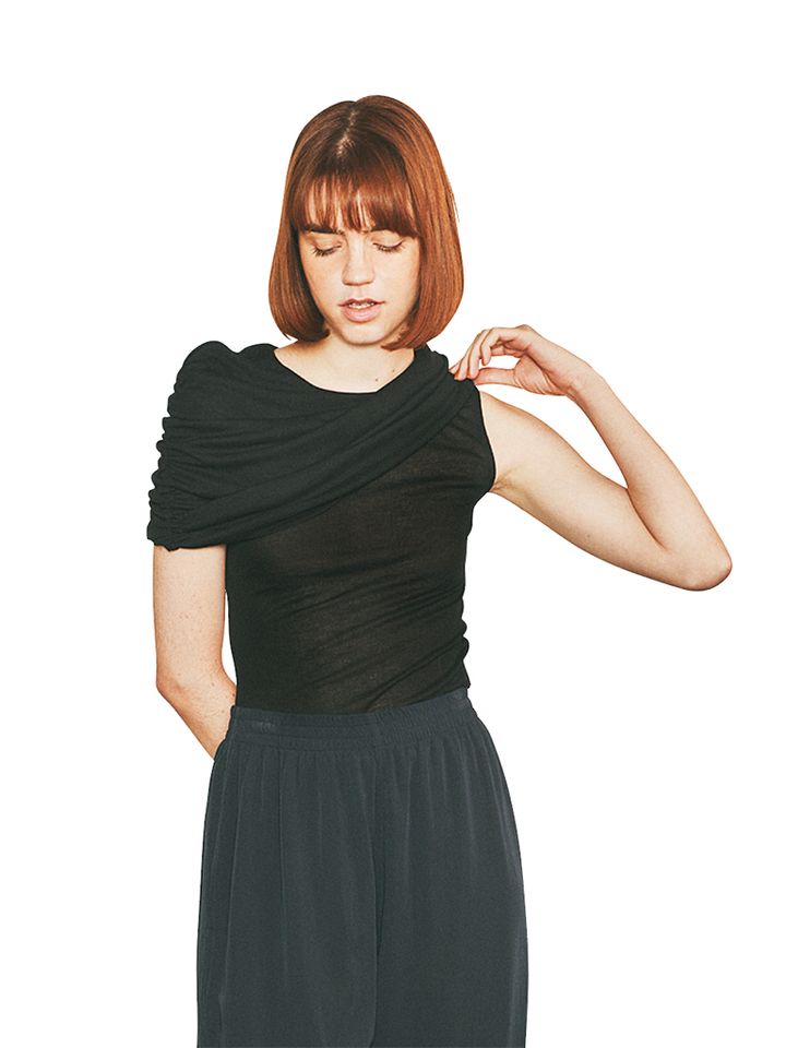シアーカバートップス/kiehtova(フーブス) タンクトップの首元に、豊富なギャザーをほどこしたカバーをドッキング。ひじ上までおろすことができて、オフショルダー風の見た目に変化。レイヤードにより身ごろの透けが気になりにくくなり、着映えも安心感も約束。