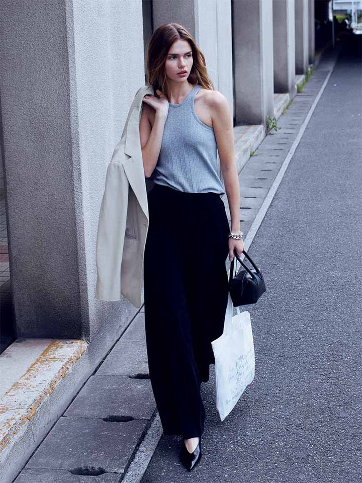 脚をすっきりと見せながら体型もカバー。ワイドなシルエットながら、落ち感の美しいドレープが縦のラインを強調し、自然な脚長効果を実現。足元は黒のパンプスで統一感を出し、さらなる美脚効果を狙って。黒ワイドパンツ/ビロット(THI RD MAGAZINE) グレーリブタンクトップ/SLOBE IENA(SLOBE IENA 自由が丘店)