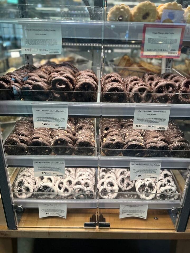 ガラスケースの中に焼きたてのプレッツェルやクッキーがずらり