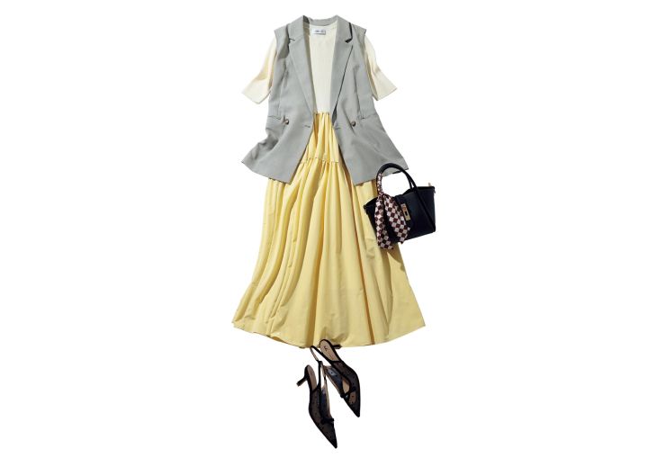 イエロー×グリーンの爽やかスタイル。ハッピーカラーのワンピは着るだけで気持ちが上向きに。フェミニンなドッキングワンピも、ハンサムなジレを重ねるだけでグッとシャープに更新できます。