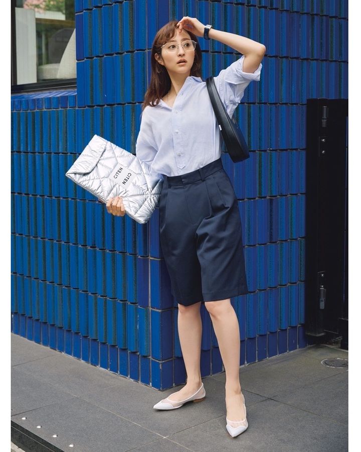 7月28日(月)、淡ブルーのシャツにネイビーのセンタープレス入りパンツを合わせて、清潔感ときちんと感を両立。袖をラフにロールアップすれば、程よい抜け感も。足元はシアー素材のフラットシューズ。つま先&かかとが隠れているから、涼しげなのにきちんと感もキープ。サンダルが難しい通勤シーンにもぴったり。