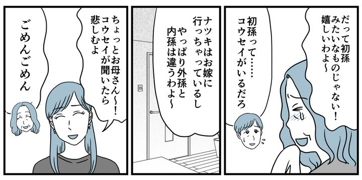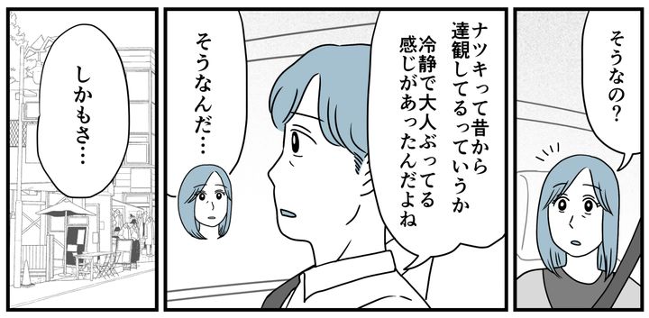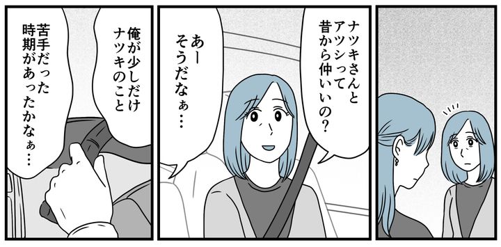 私たちの妊娠報告を、義母は涙ながらに喜んでくれました。「だって初孫みたいなものじゃない!」そんな会話をしながら、私は笑っているようで笑っていないナツキさんの様子が少しだけ気になりました。帰りの車内でアツシに聞いてみます。