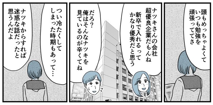 ナツキさんは地元の国立大学を出て、有名な大手企業に勤めています。「昔からいつも勉強を頑張っててさ。俺はそんなナツキを見ているのが辛くてね。まぁ今思えば完全にコンプレックスの塊だったんだな」アツシはそう語りました。