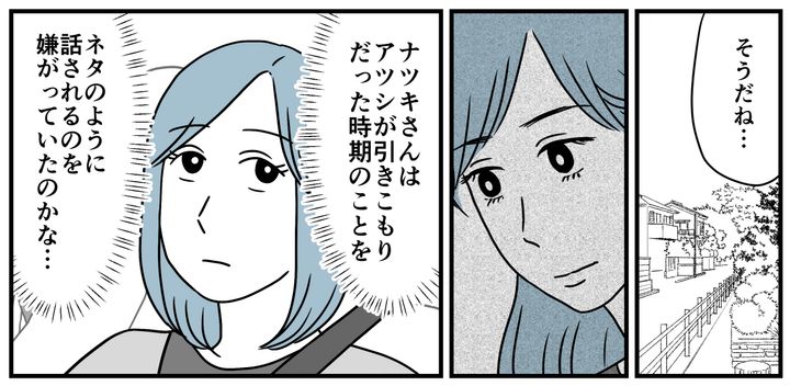 一方で、そんな光景を静かに見つめるナツキさんの表情も気になっていました。アツシは自分が引きこもっていた時期に、ナツキさんに冷たく当たってしまったこともあるのだそう。ナツキさんは、まだ当時のことを笑い話にできないような複雑な気持ちを抱いているのかもしれない……そんなふうにも感じました。