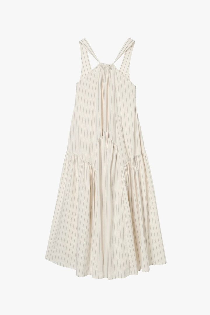 「このティアードワンピは、フワッと広がるフレアシルエットがドラマティックな印象。ランダムにうまれるドレープとコットン地のストライプ柄で、甘さ控えめに着こなせる一枚です」ワンピース¥44,000(Venica)