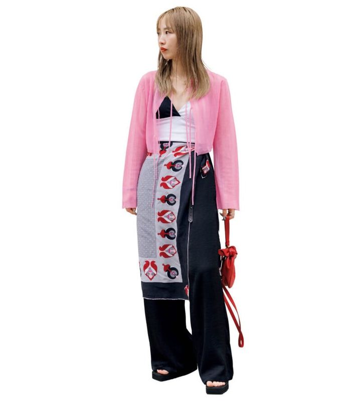 「夏らしいフレッシュなピンクのシアーカーディガンを主役に、涼やかな透け感を楽しめるトレンド顔な着こなしに。大人っぽく仕上げるには小物使いがポイントで、シックなヴィンテージスカーフはボトムにひと巻きするだけで夏のお洒落を格上げしてくれる存在です」