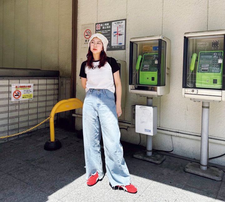 トップス¥7,150、メガネ¥4, 950/ともにローズバッド(ローズバッド ルミネエスト新宿店)、ローズバッドのボトム、プーマのシューズ、La Maison de Lyllisのハット、ADD CLUMNのバッグ/以上すべて本人私物