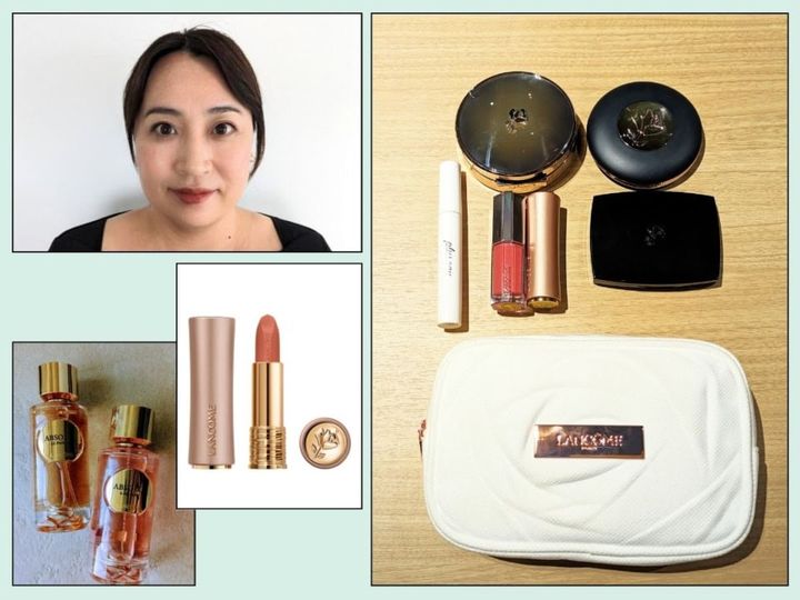 「ランコムのオリジナルポーチは、コンパクトなのに意外と入るところがお気に入りです。白は汚れやすいものの、気持ちが明るくなります。ポーチに入れるアイテムは、その日に使うものを毎朝セレクト。人と会う予定がなくても“万が一”に備え、自信が持てるメイク直しをできるアイテムは、ミニマムですが持ち歩くようにしています」