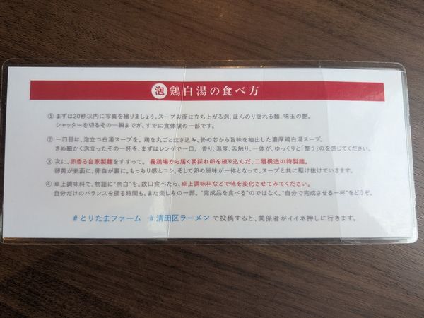 注文後にお店の方が持ってきてくれたのは、ラーメンの食べ方説明書。ラーメン到着後、20秒以内に写真を撮ってすぐにスープを飲むのがおすすめとのことなので、いつ来てもいいようにカメラを準備し、スタンバイOK!