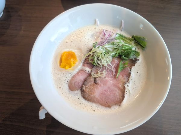 丸ごと鶏のうまみを余すことなく引き出した白濁のスープは、『飲む鶏』というにふさわしい。あっさりに見えるスープですが、濃厚なしっかり味でした。そして自慢の自家製麺は卵の香りが漂い、ほどよい弾力があるもちもち食感。トッピングは炙りレアチャーシュー・とろとろ味玉・ネギ・玉ねぎ(アーリーレッド)・水菜です。