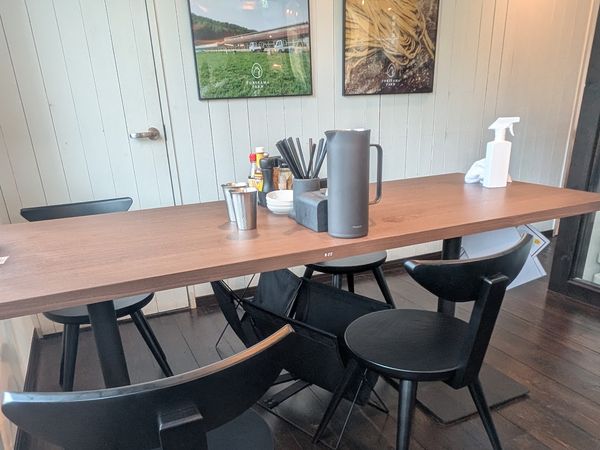 カフェのような店内にはシンプルなテーブルと椅子がありました。テーブルの下には荷物入れ、そしてテーブルには味変用の調味料が置いてあり自分好みの味で食べられるようです。