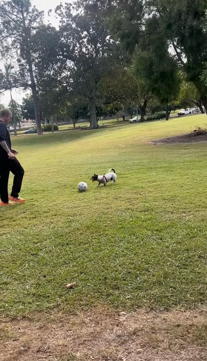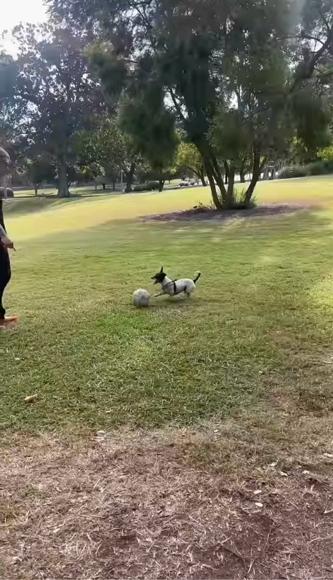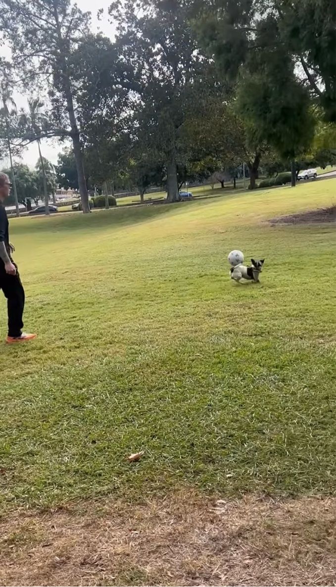 猛ダッシュでボールに追いつくと、ドリブルしながら器用に飼い主さんのもとへ蹴り返しました。 ジェイミーは、こうして飼い主さんとサッカーをするのが大好きなんです!