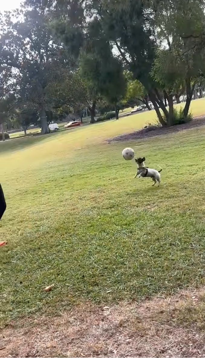 サッカーが大好きなミニチュア・フォックス・テリア。 飼い主さんが蹴ったボールに素早く反応し、正確なコントロールで蹴り返す様はお見事です!