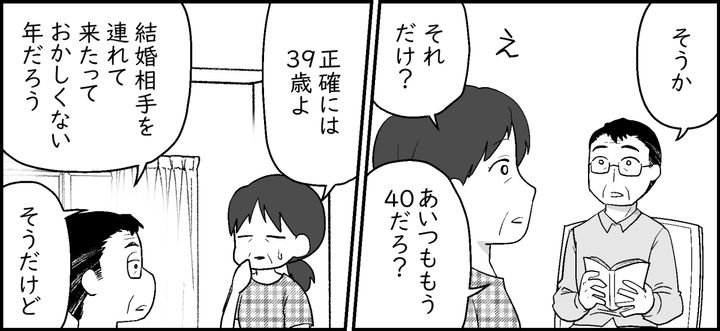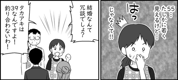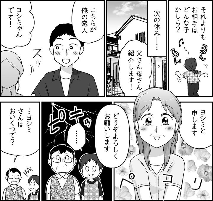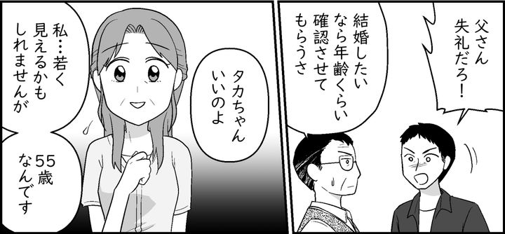 しかしタカアキが紹介してきたのは55歳のヨシミさん。こんなことってあるのでしょうか。年齢であれこれ言いたくはないですが、まだ30代の息子の相手がこんなに年上だなんて……! 私は大きく動揺してしまったのでした。