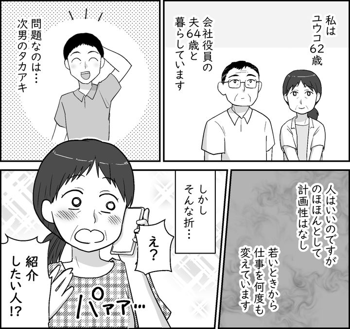 私はユウコ(62歳)。会社役員の夫(64歳)と2人暮らしをしています。私は仕事で多忙な夫を支え、専業主婦として息子2人を育てあげました。今や長男(41歳)は名の知れた企業に勤め、結婚して子どももいます。しかし問題なのは……次男のタカアキ(39歳)。若いときから海外を放浪したり、仕事を何度も変えたりしていました。明るい性格なのですが、フラフラしがちでなにかと心配。最近は新しい会社で頑張っていると聞いていたのですが……。