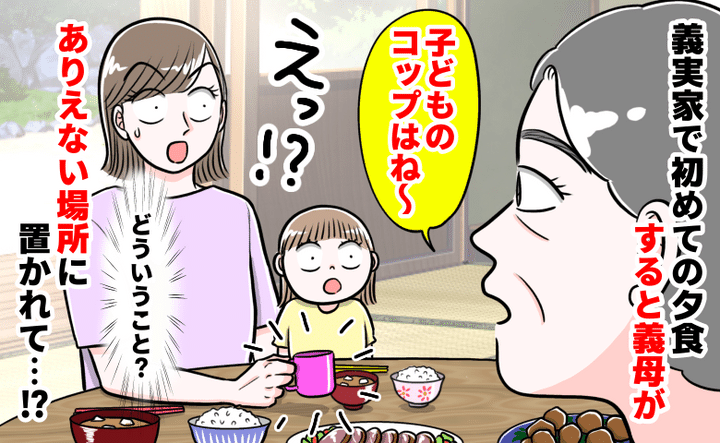 3. 義実家で初めての夕食、義母が娘のコップを“ありえない場所”へ。謎ルールに戸惑いつつ夫を見ると!?