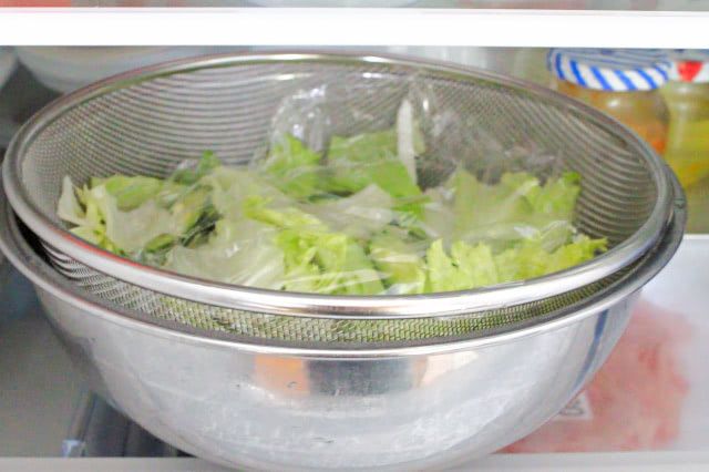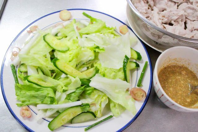 野菜を水に浸けっぱなしだと味が抜けるので、サッと洗って冷蔵庫で冷やした方が適度に水分を吸って野菜がシャキシャキになるそうです。豚肉が茹で上がるまで冷蔵庫で冷やしておきました。