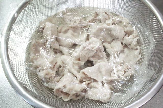 5. ザルやバットに出来るだけ広げて豚肉を乗せ、ラップをふんわりかけて粗熱を取ります。