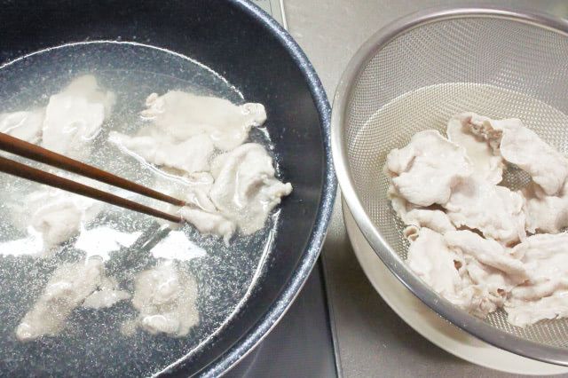 4. 1のお湯がポコポコと沸いたら豚肉を入れ、火を止めて色が変わったものから引き上げます。