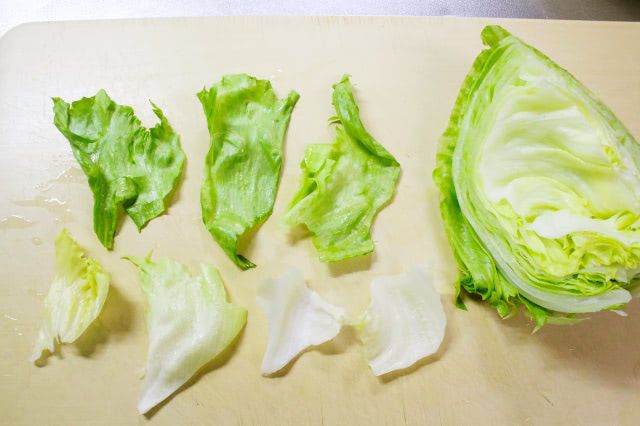 2. レタスを食べやすい大きさにちぎって水(分量外)に浸します。