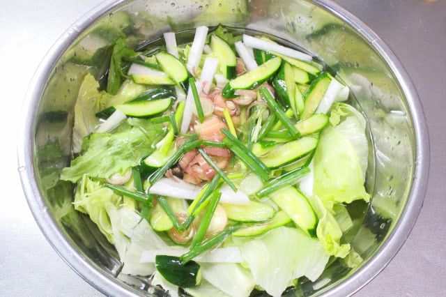 3. きゅうりを縦半分に切って幅5mmくらいの斜め切りに、大根を5mm角くらいの拍子木切りに、みょうがを小口切りに、長ねぎを長さ5cmくらいに切り、レタスの入ったボウルに浸します。
