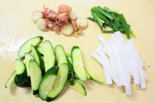 きゅうり、大根、青ねぎは食べやすい長さに、みょうがは幅3mmほどの小口切りにしました。