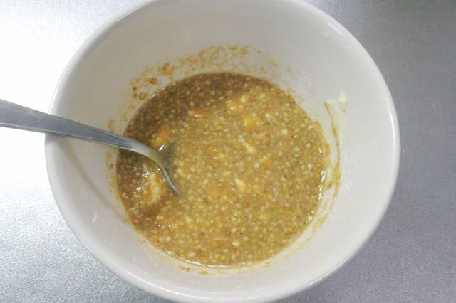 6. すりゴマ、マヨネーズ、ポン酢じょうゆを混ぜてドレッシングを作ります。