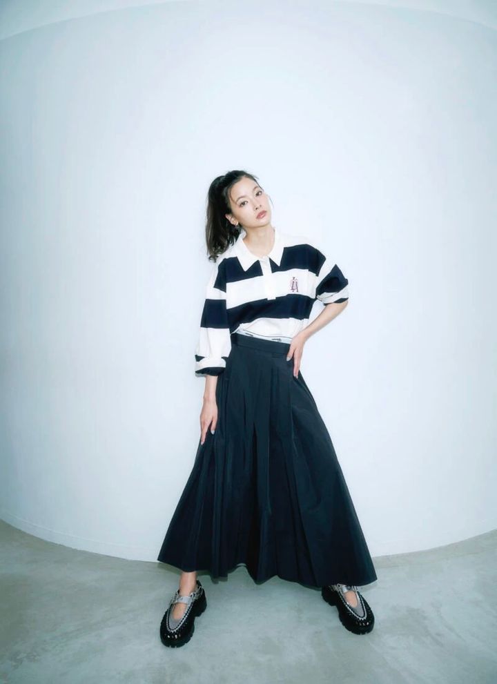 ギャザーをふんだんに寄せたボリュームのあるシルエットが美しいスカートは、光沢とハリのある機能素材を使用しながらも上品な佇まいが印象的。ボーダー柄のラガーシャツを合わせ、ウエストからはインに重ねたボクサーショーツのロゴ部分だけをチラ見せ。適度にカジュアルダウンして。