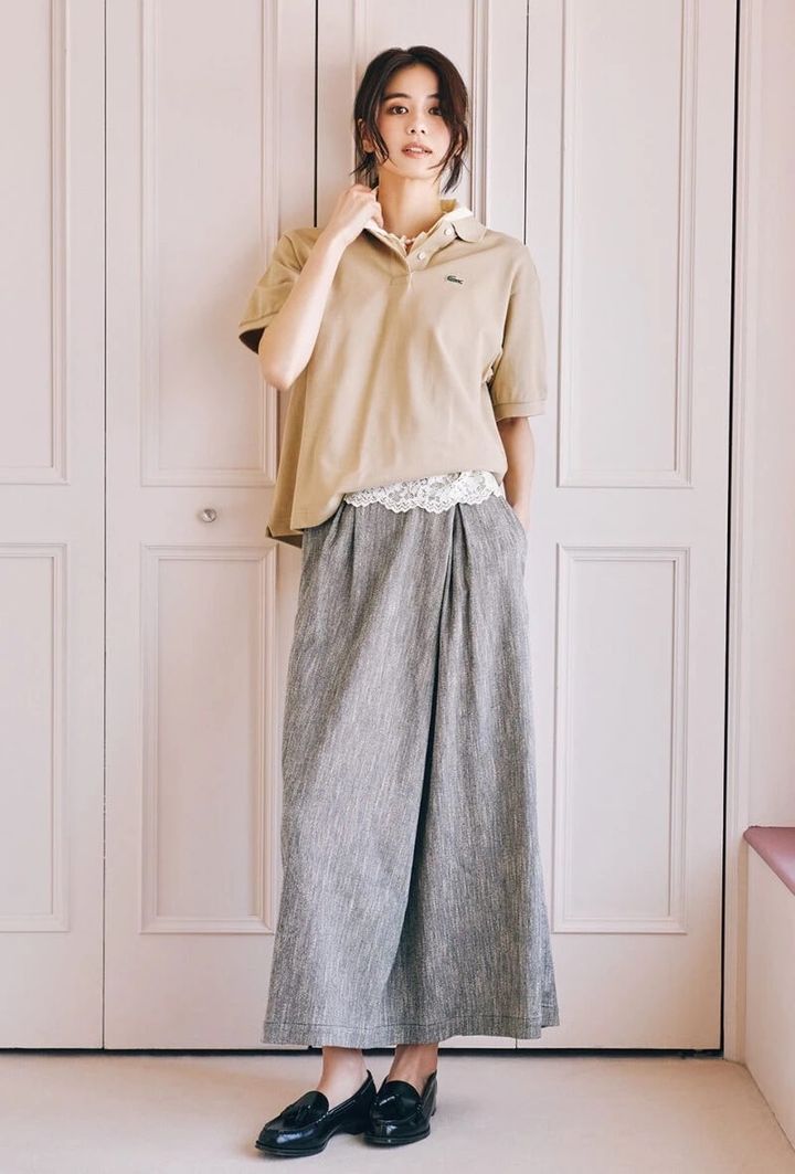 今季のポロシャツはサイズ感が肝に。きちんとした着こなしではなく、ゆったりストレスフリーに着るのが正解。メンズライクなポロの中にレーストップスを仕込んで、旬のロマンティックなムードをプラス。襟元も重ねつつ、広く開けることで抜け感ポイントになる。