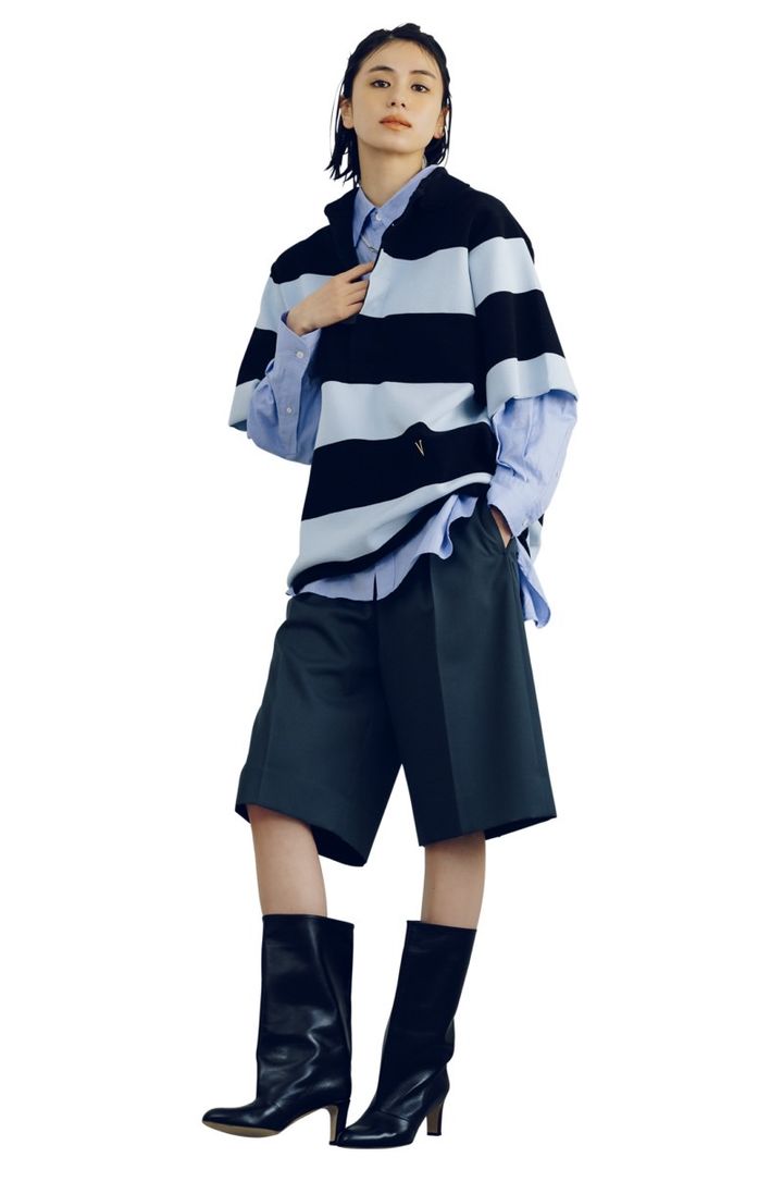 トップス¥31,900(ヴェニット/ハルミ ショールーム) サックス別注シャツ¥25,300 (アメリカーナ フォー サロン/サロン アダム エ ロペ) バミューダパンツ¥29,700(ロエフ/エイチ ビューティー&ユース) ネックレス¥55,000(ブランイリス/ブランイリス トーキョー) ブーツ¥83,600(ネブローニ/ピモンテ)