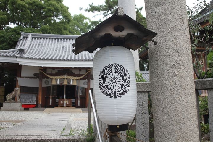 神社の紋にあしらわれている「青山菊」は尼崎城の家紋と同じ。宮司さんのお話によると、尼崎城とも関わりがあったのではとのことです。